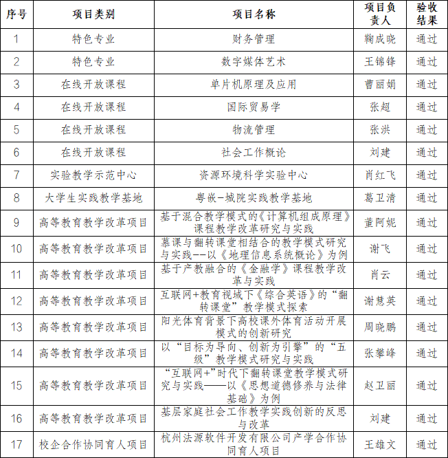 本次验收通过的17个项目中,包括特色专业2项、在线开放课程4项、实验教学示范中心1项、大学生实践教学基地1项、高等教育教学改革项目8项、校企协同育人项目1项(具体项目信息见下表)。