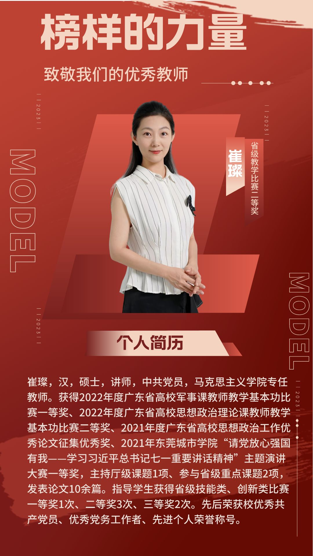 本次大赛由广东省教育厅组织开展,旨在加强高校思想政治理论课青年教师队伍建设,提升思想政治理论课教育教学质量。比赛从全省70多所高校中遴选出65名优秀教师进入复赛,最终评审确定一等奖6名、二等奖12名、三等奖47名。