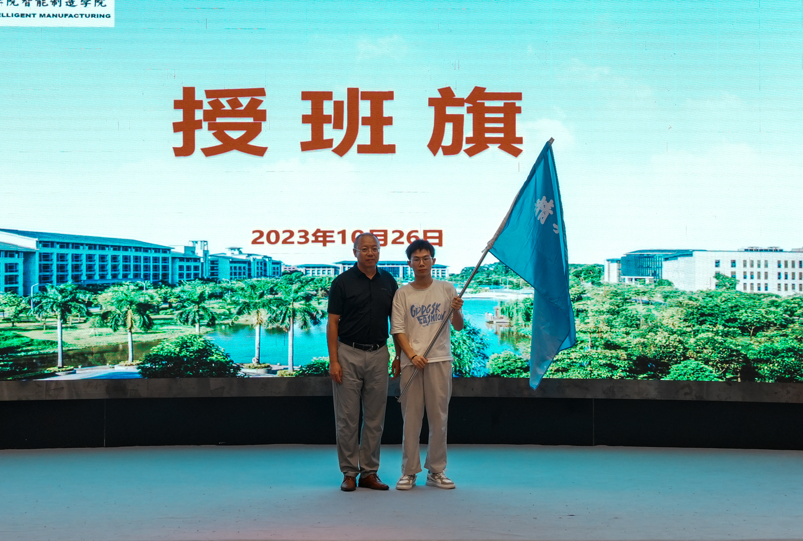 在开班仪式的关键时刻,由教务处处长杨勇虎为汇乐精英工程师班授旗,学生代表王伟杰同学接旗。