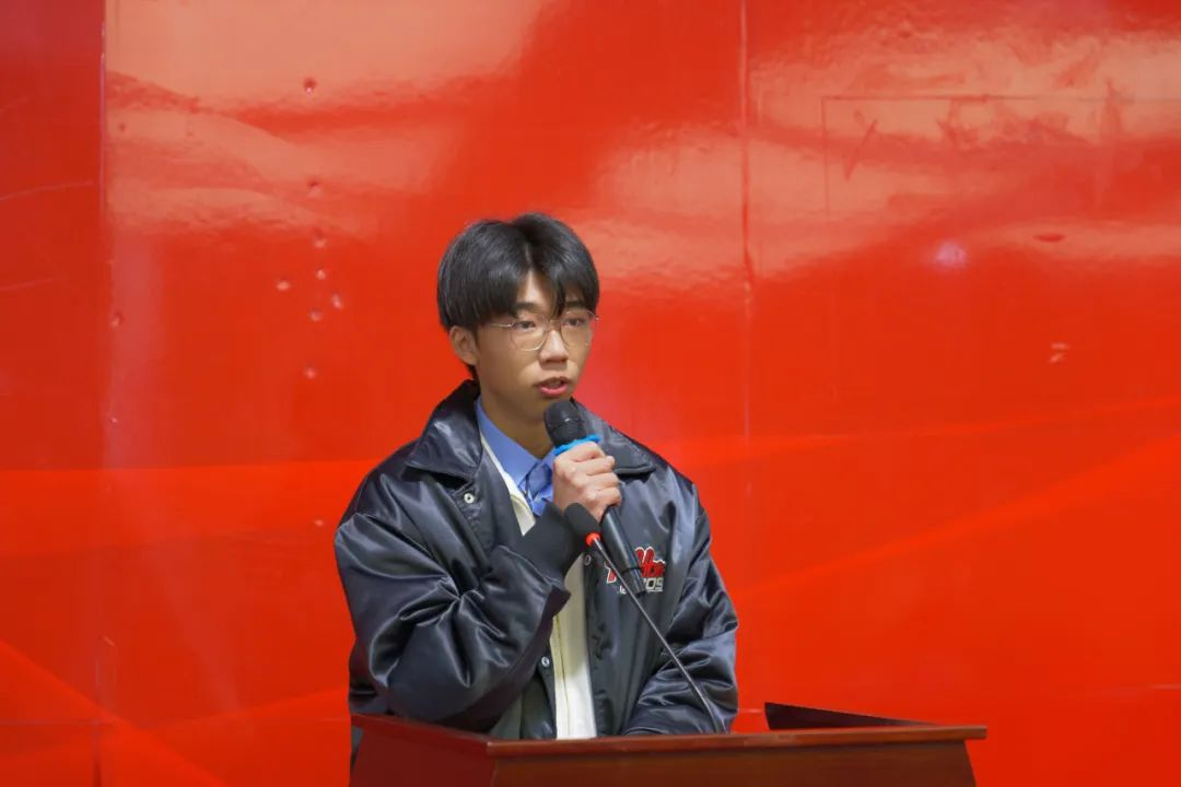 2022级卓越班谢翊曦作为卓越班老生代表进行发言。他从卓越班的学习生活、大学学习方法、个人比赛经历分享和对老师和同学们感谢四个方面,分享了自己在卓越班的成长经历和感悟,鼓励大家以认真负责的态度面对困难,攻克问题,为学院斩获荣誉,坚定内心,勇往直前。