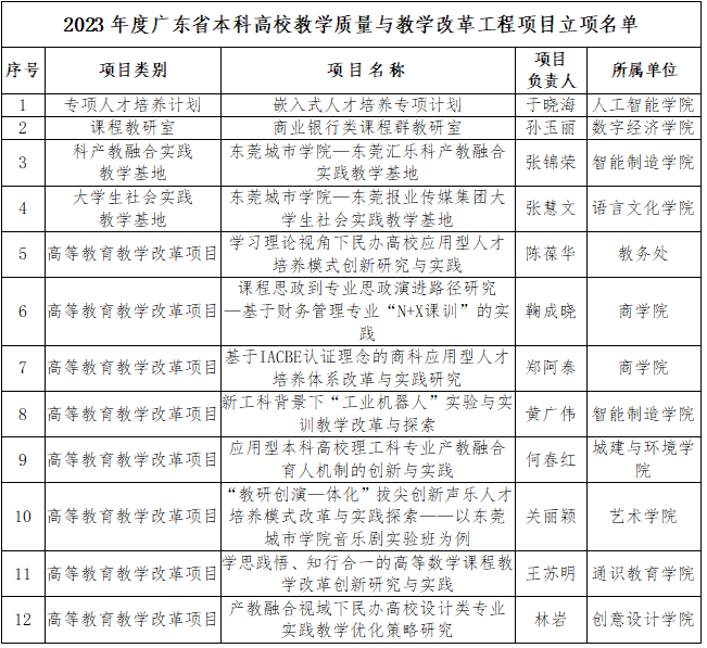 近日,广东省教育厅公布了2023年度广东省本科高校教学质量与教学改革工程项目立项建设名单(粤教高函[2024]9号),米兰milan申报的专项人才培养计划1项、课程教研室1项、科产教融合实践教学基地1项、大学生社会实践教学基地1项、高等教育教学改革项目8项等共12个项目全部入选为省级建设项目,立项率为100%。