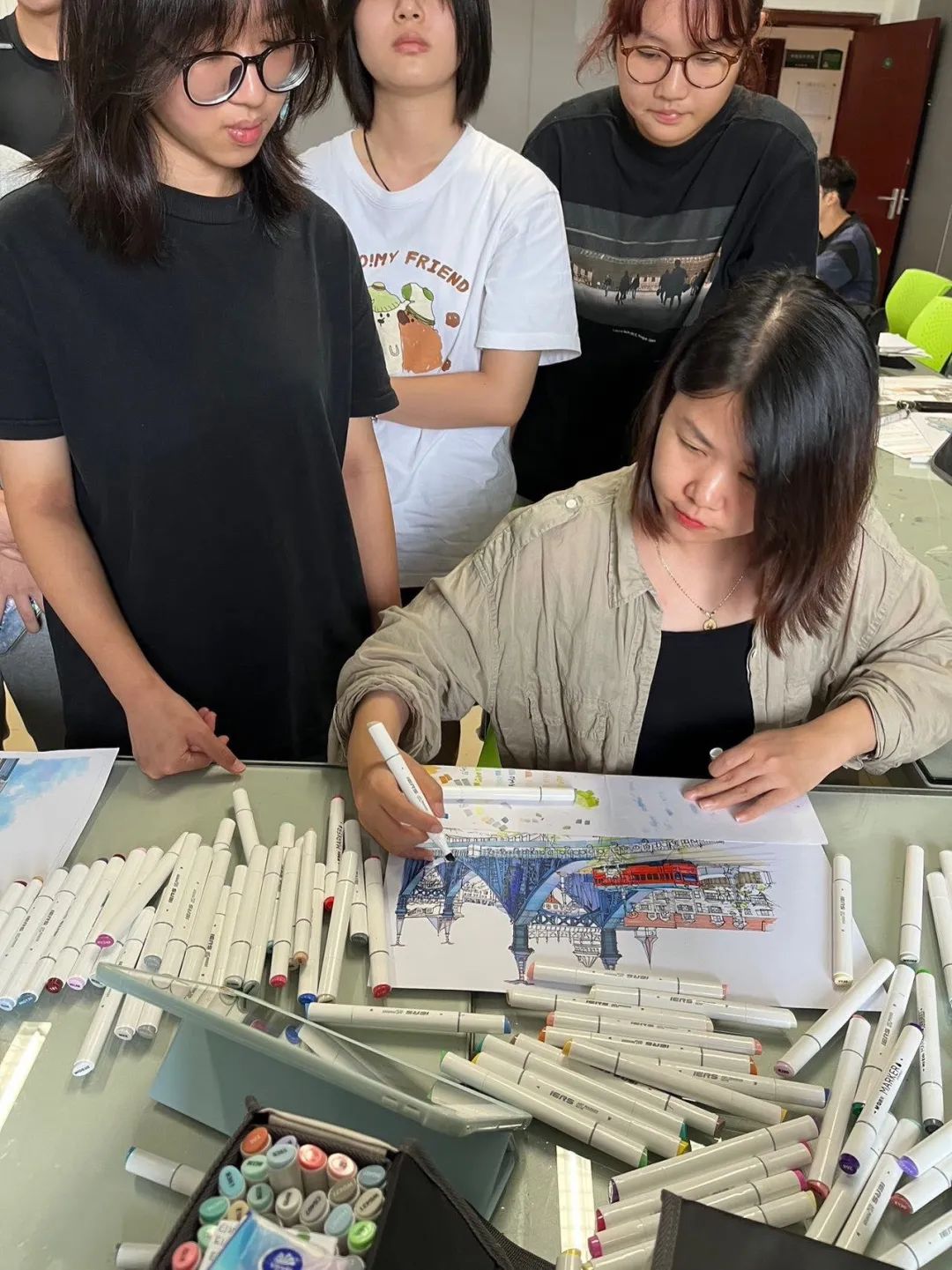 谈及如何想到将学校的风景融入到课堂实践?鲍老师表示,学校风景优美且充满人文气息,是一个非常好的创作题材,能让学生对自己的大学校园有更深切的感受,并且在课堂创作中可以体验到对校园的浓厚情感,能够更好地激发学生们的技法创作欲望。