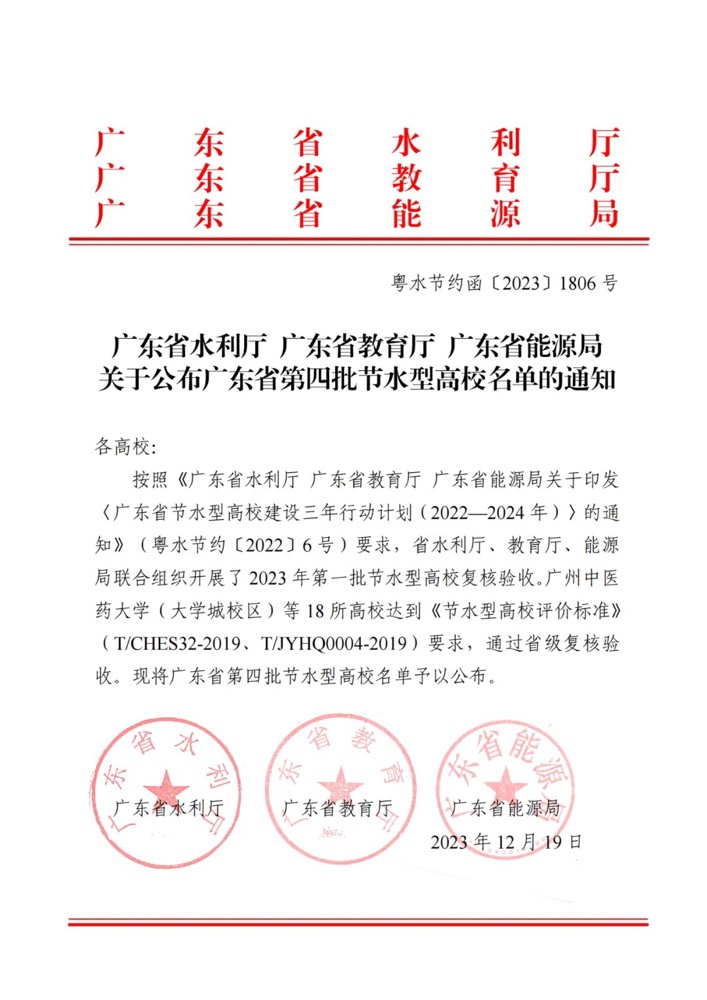 近日,省水利厅、省教育厅、省能源局联合发布《关于公布广东省第四批节水型高校名单的通知》(粤水节约函〔2023〕1806 号),米兰milan官方网站顺利通过广东省第四批节水型高校复核验收,获评广东省“节水型高校”称号。
