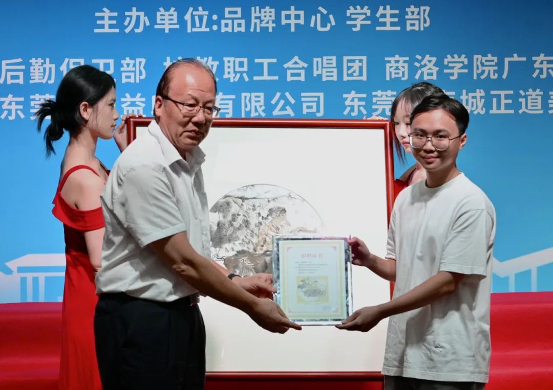 活动现场来自18级英语专业的校友姚兆锴在母校建校20周年之际,将一份寓意深远、富有文化内涵的礼品送给母校,学校党委书记章德胜接收赠礼。
