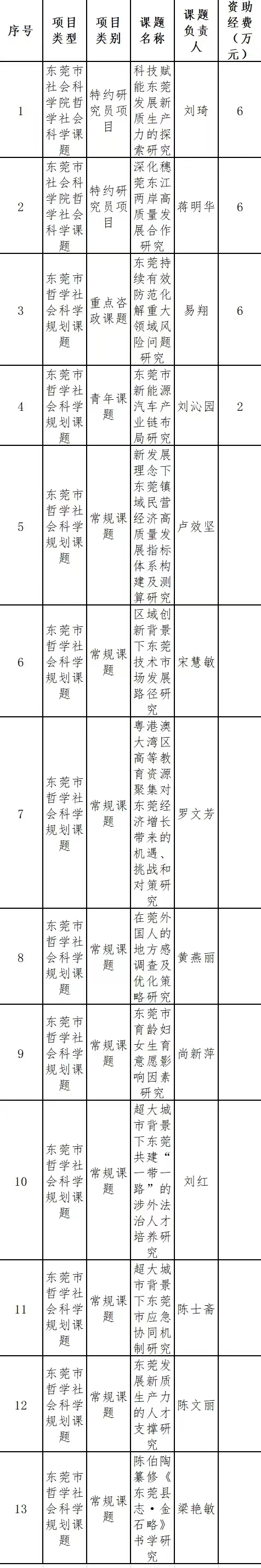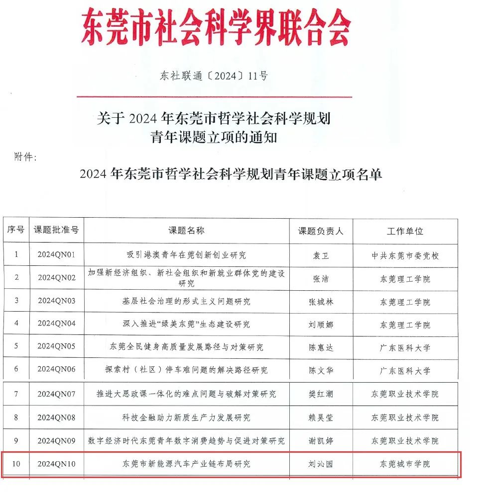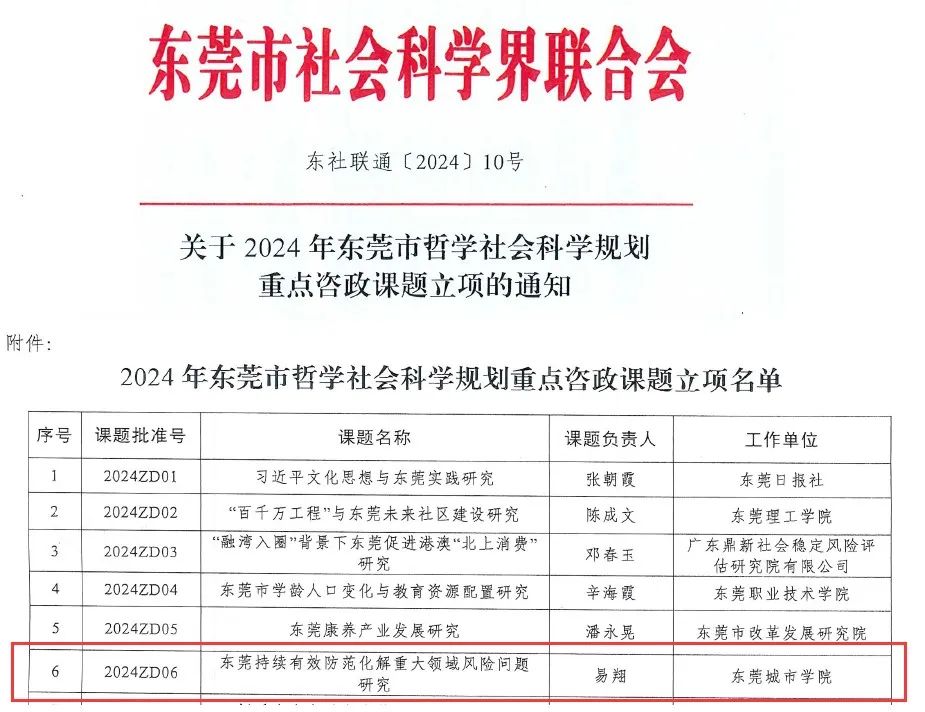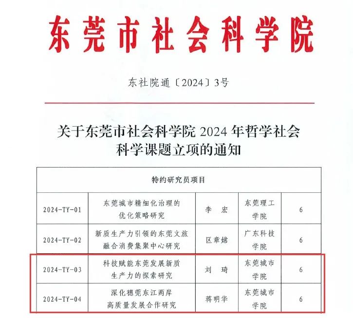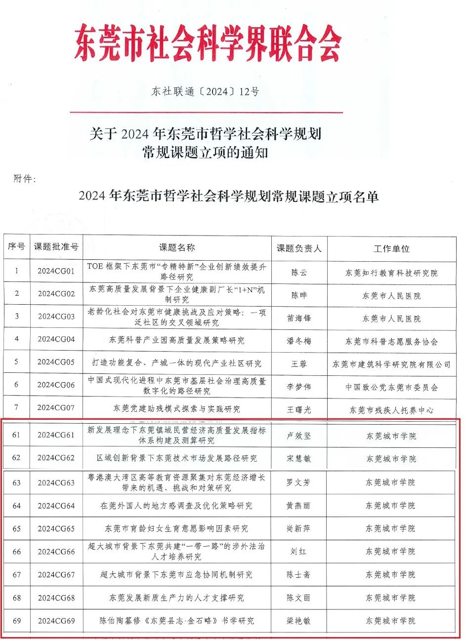 近日,东莞社科联和东莞市社科院分别公布了2024年东莞市哲学社会科学规划课题和东莞市社会科学院2024年哲学社会科学课题立项名单,米兰milan共有13项课题喜获立项,其中特约研究员项目2项,重点资政课题1项,青年课题1项,常规课题9项,获资助经费共计20万元,具体立项名单见下表:
