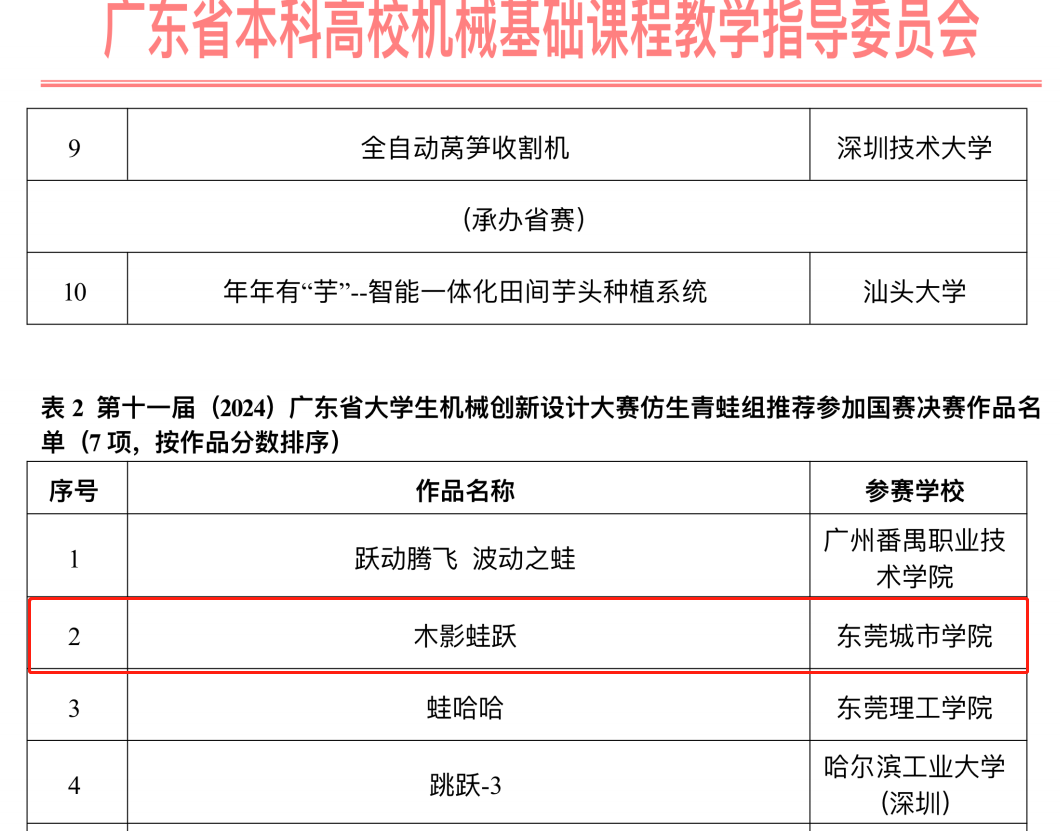 其中一等奖一项、二等奖两项、三等奖一项。由陈洵凛、李晓彦老师指导的作品“木影蛙跃”荣获一等奖;由谭海欧、阮育煌老师指导的作品“豌豆自动种植机”和吴蕾、丁娟老师指导的”小型自走式钵苗移栽机”荣获二等奖;由张锦荣、罗彦琦老师指导的“智慧农耕多功能自动播种机”获得三等奖。其中陈洵凛、李晓彦老师指导,何子杰、徐燕婷、邱杰铭、戴兴继、马郁烨同学设计并制作的作品“木影蛙跃”以仿生组第二名的好成绩,获得参加全国竞赛的资格。