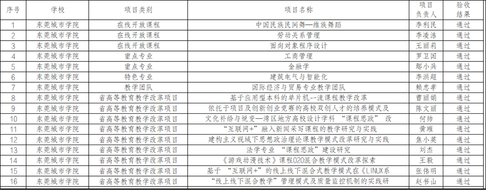 本次验收通过的16个项目中,包括在线开放课程3项、重点专业2项、特色专业1项、教学团队1项、高等教育教学改革项目9项(具体项目信息见下表)。其中,重点专业的顺利结项,是学校专业建设工作的又一重要成果。