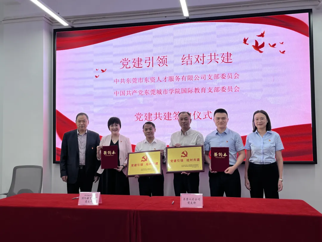 在众人期待的目光中,国际教育党支部书记罗文芳与东莞市东资人才服务有限公司党支部书记苏可明代表双方郑重签订了结对共建合作协议。这一历史性时刻被相机定格,成为双方合作征程中的重要里程碑。它标志着双方将齐心协力、携手共进,朝着提升共建促党建、党建促发展的目标努力奋进,为东莞市人才与教育事业发展增添强劲动力,共同谱写辉煌篇章。