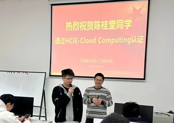 2025年3月19日上午,在人工智能学院软工专升本2024级1班的实验课堂上,发生了一幕特别的颁奖仪式。执行院长、任课教师张伟明利用上课前的时间,为成功获得华为HCIE-Cloud Computing认证的学生陈桂堂颁发了纪念品,这一小小的仪式不仅激励了全班同学,也为他们提供了宝贵的学业与职业规划教育。