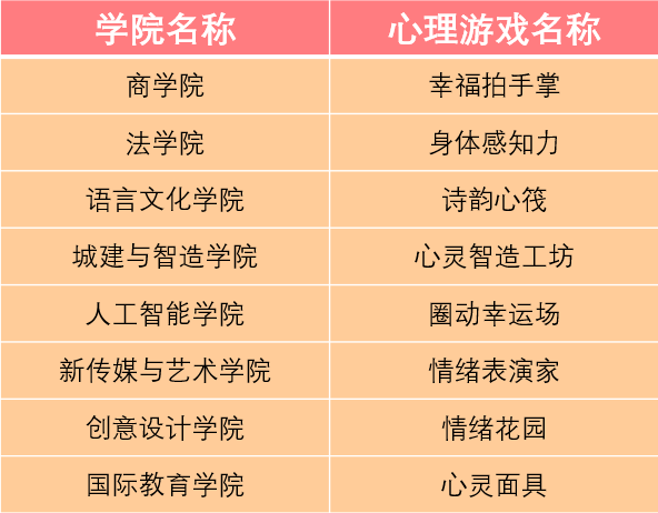 心理游戏区由各个学院提供游戏方案,今年共设置八个游戏摊位,每个学院一个摊位。介绍如下: