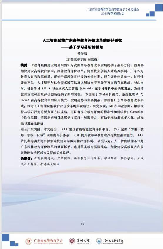 在10月25日的分会场研讨中,杨许亮副教授以《人工智能赋能广东高等教育评价改革的路径研究——基于学习分析的视角》为题,系统阐述了机器学习与生成式人工智能在高等教育评价中的应用潜力。他指出,当前广东高教强省建设面临评价体系单一、过程性评价不足等挑战,而人工智能技术可通过学业预测、个性化反馈等功能,推动教育评价向多元化、科学化方向发展。结合广东实践,他提出构建省级智能教育评价平台、完善多维评价体系、提升教师AI素养等具体路径,为粤港澳大湾区高等教育高质量发展提供了新思路。