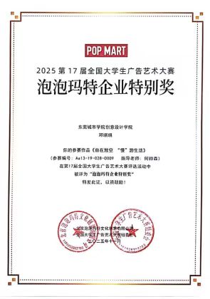 在刚刚结束的第十七届全国大学生广告艺术大赛(大广赛)中,由创意设计学院何帅森老师指导,邓琪琪同学创作的作品《自在放空“慢”游生活》从全国29个赛区作品中突出重围,不仅荣获国家级三等奖,更一举摘得本届大赛最具商业分量的奖项——[泡泡玛特]企业特别奖。这一奖项的获得,标志着创意设计学院学生的创意成果实现了从“课堂优秀作业”到“市场高度认可”的关键跨越,是学院应用型人才培养与校企深度融合的标杆性成就。