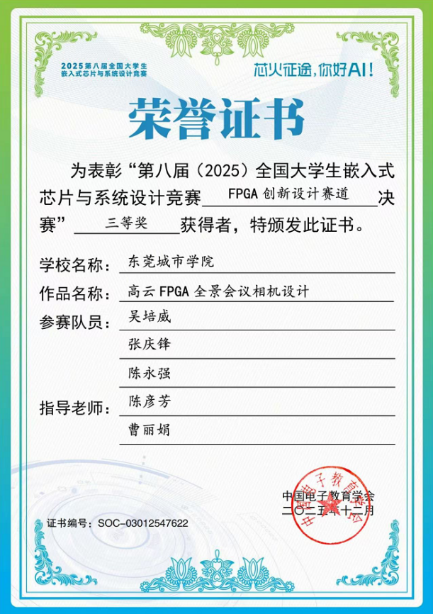 喜讯传来!在刚刚结束的2025年全国大学生嵌入式芯片与系统设计竞赛——FPGA创新设计赛道的全国总决赛中,米兰milan首次参赛,城建与智造学院吴培威、陈永强、张庆锋三位同学,凭借作品《高云FPGA全景会议相机设计》斩获全国三等奖,取得历史性突破!