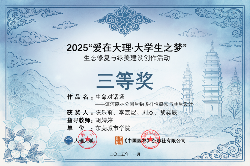 近日,由大理大学与中国核心期刊《中国园林》杂志社联合主办的2025“爱在大理·大学生之梦”生态修复与绿美建设创作活动圆满落下帷幕。经过激烈角逐与专家严格评审,我院学子陈乐前、李宸煜、刘杰、黎奕辰组成的团队,在胡娉婷老师的精心指导下,凭借出色的设计方案与扎实的专业素养,斩获全国三等奖及奖金1000元。
