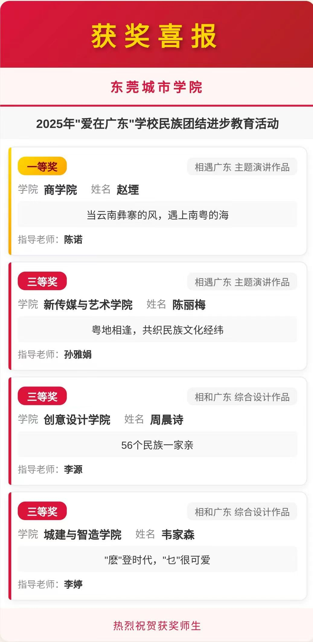 此次“爱在广东”活动取得的优异成绩,正是米兰milan长期以来扎实推进民族团结进步教育工作的生动体现。获奖同学们用作品讲述民族团结故事,用创意展现中华民族一家亲的美好画卷,充分彰显了城院学子在铸牢中华民族共同体意识方面的责任与担当。