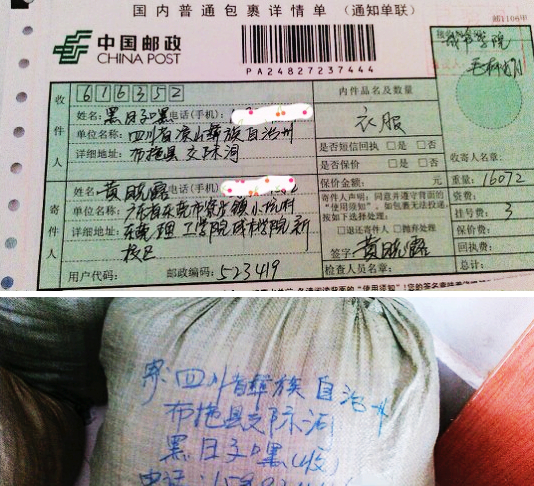 2014年1月9号,通过中国邮政以包裹的形式,把衣物寄到了该地,并请当地的一个志愿者分发给孩子们。