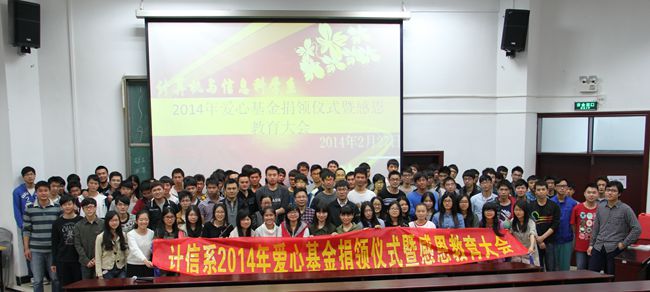 作者:2月27日,计信系在7B301举办2014年爱心基金捐领仪式暨感恩教育大会,计信系党总支书记葛卫清、副书记林胜凯、团委老师陈浩华,辅导员彭俐、都振华,班主任以及来自各年级、各专业的学生代表共计200余人参加会议。
