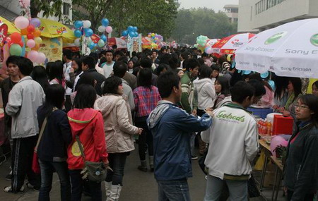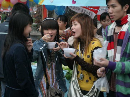 我院文学与艺术系、计信系、机电系、财经系、管理系以及32个社团中幸运抽到摊位的5个社团在校园内各张旗鼓,各种海报风起潮涌,校道上可谓是人山人海,喜气融融。谁说天公不作美,今天是有柔和的风又有缠绵的雨,都说“风是爱的呼唤,雨是情的交融”,风雨更增了不少风情。你唱我和,琳琳琅目的食物,让人想说不爱你都不行!特别是文学与艺术系的“滋润的季节”--绿色食品,清凉美容;财经系的“花果年华”—创新食品,美味可口;一切从健康出发,同时还增强了同学们的环保和创新意识。