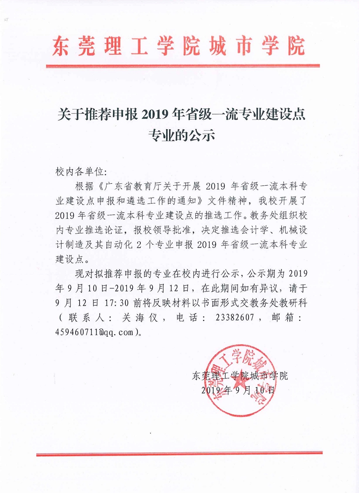 关于推荐申报2019年省级一流专业建设点专业的公示