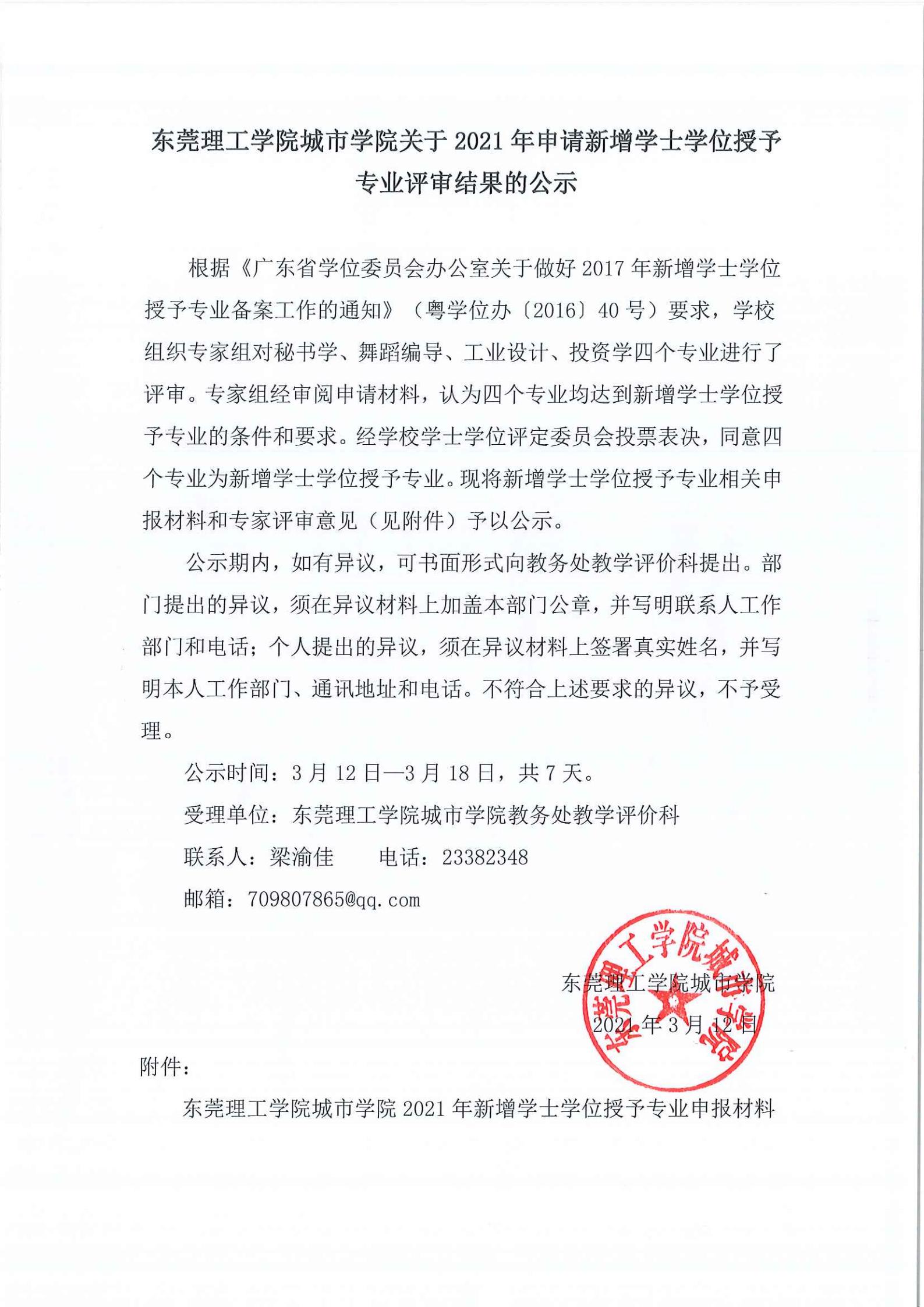 东莞理工学院城市学院关于2021年申请新增学士学位授予专业评审结果的公示