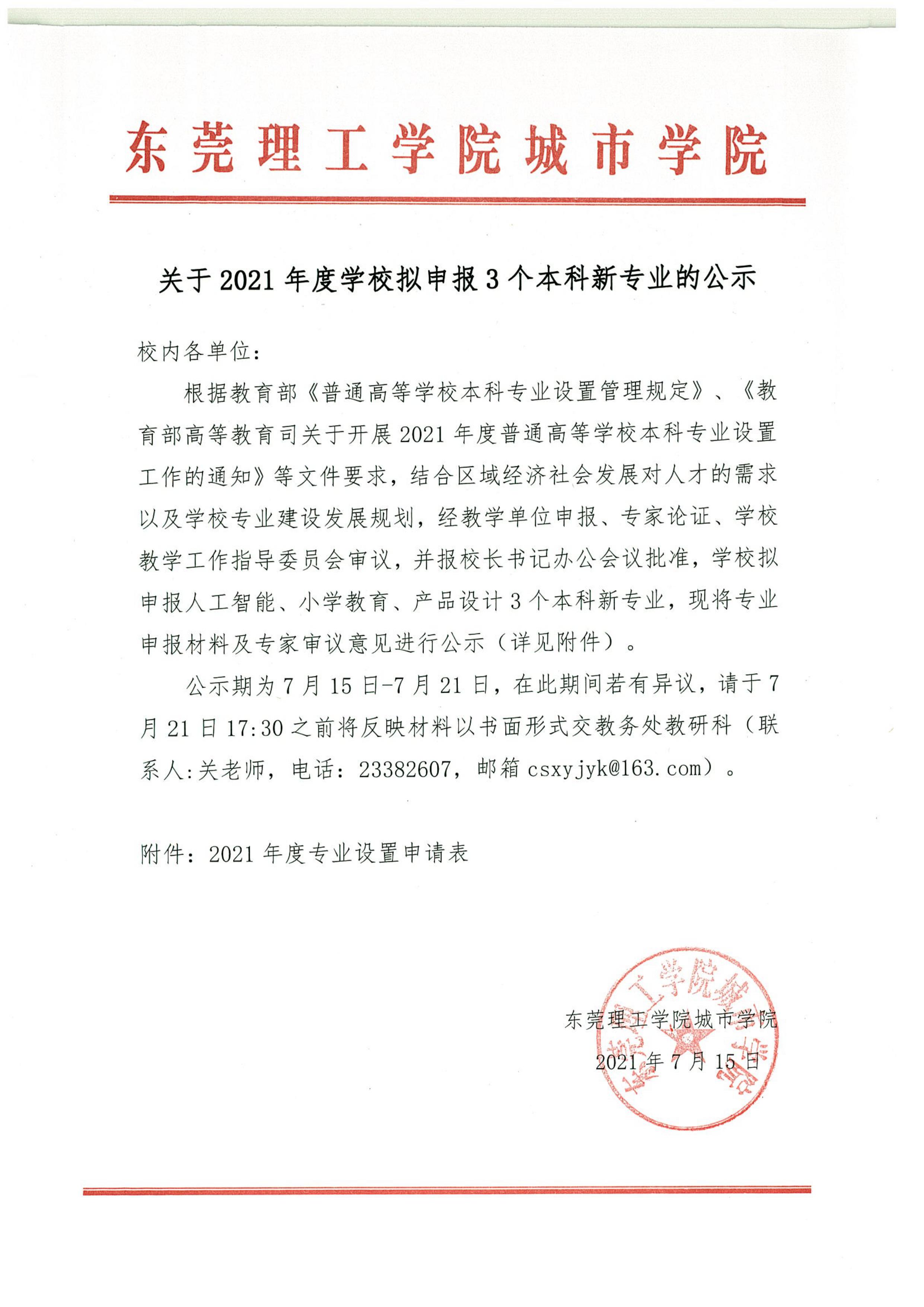 东莞理工学院城市学院关于2021年度拟申报3个本科新专业的公示